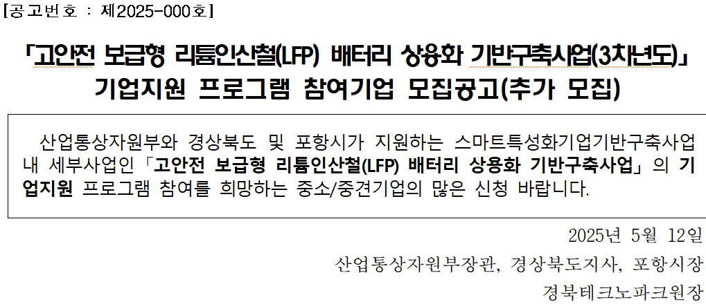 고안전 리튬인산철(LFP) 배터리, 우리 기업이 상용화 주역이 된다! 🔋 산업통상자원부, 경상북도, 포항시가 지원하는 「고안전 보급형 리튬인산철(LFP) 배터리 상용화 기반구축사업」의 기업지원 프로그램에 참여할 기업을 추가 모집합니다. 시제품 제작, 시험·평가 등 파격적인 지원 내용을 놓치지 마세요!