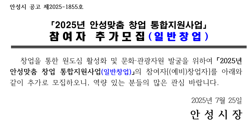 - 접수 방법: 안성시청 일자리경제과 방문 또는 우편 접수 (마감일 18시 도착분 한정)