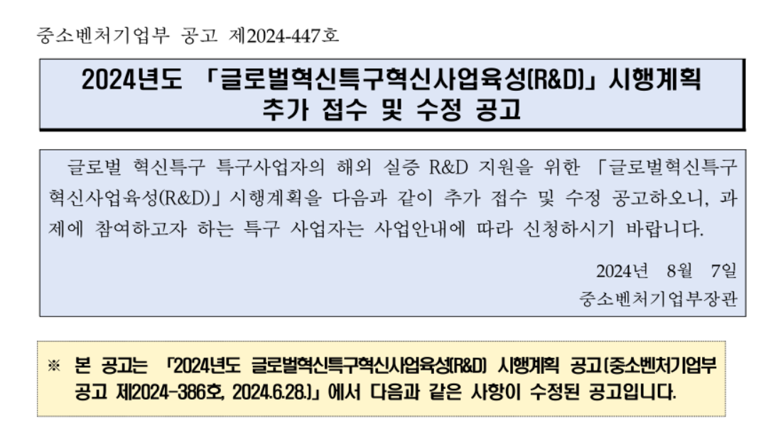 안녕하세요, 여러분! 오늘은 2024년 글로벌혁신특구혁신사업육성(R&D) 시행계획에 대해 소개해 드리려고 합니다. 중소벤처기업부에서 발표한 이 계획은 국내 중소기업과 벤처기업들이 글로벌 시장에서 경쟁력을 갖출 수 있도록 지원하는 중요한 프로그램입니다. 이번 공고는 추가 접수 및 수정 사항을 포함하고 있어, 관심 있는 기업들에게 매우 유익한 정보가 될 것입니다.