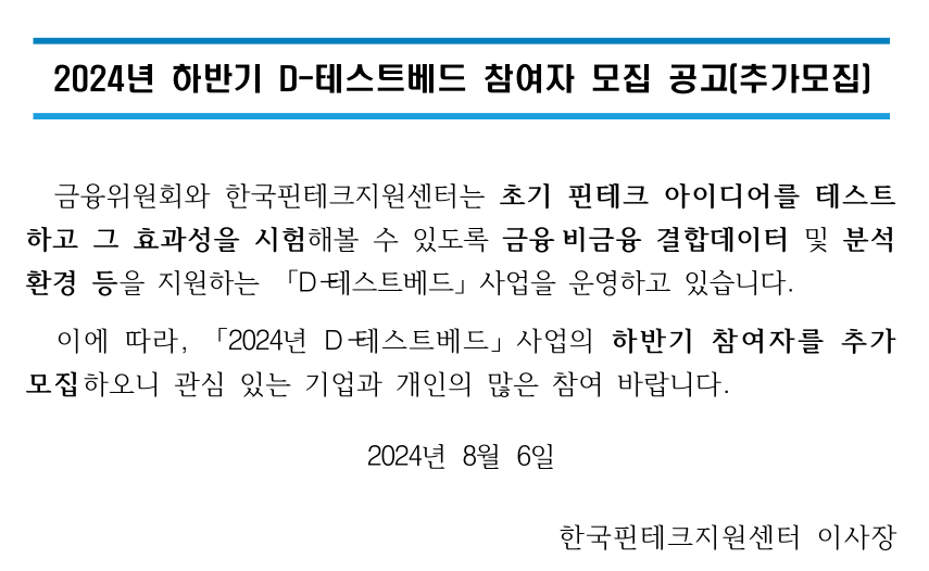 안녕하세요, 여러분! 오늘은 2024년 하반기 D-테스트베드 참여기업 추가 모집 공고에 대해 소개해드리려고 합니다. 이번 공고는 금융위원회 한국핀테크지원센터가 주관하는 사업으로, 초기 핀테크 아이디어를 테스트하고 그 효과성을 시험해볼 수 있도록 다양한 지원을 제공하는 것을 목표로 하고 있습니다.
